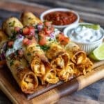 Crispy and flavorful Air Fryer Chicken Taquitos loaded with a creamy, spicy chicken filling and melted cheeses, ready in under 30 minutes. These handheld Mexican-style taquitos are perfect for a quick snack or appetizer, served with your favorite toppings like guacamole, salsa, and Mexican crema.