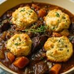 A hearty and comforting beef stew simmered to tender perfection with a rich blend of vegetables, red wine, and herbs, topped with fluffy cheddar herb dumplings that add a delightful cheesy twist to this classic dish.