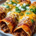 The image shows a close-up of three rolled enchiladas placed side by side on a white plate, each topped with melted yellow and white cheese with a slightly browned texture. The enchiladas have a rich red sauce coating the tortillas, which are soft and slightly wrinkled. Beneath the sauce and cheese, you can see browned ground meat filling peeking out from the ends. On top, there are small chopped white onions and fresh green cilantro leaves scattered, adding a fresh contrast. The photo is taken up close with shallow focus, highlighting the texture of the sauce and cheese. The background is a white marbled surface. Photo taken with an iphone --ar 4:5 --v 7