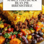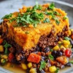 A hearty and nutritious Black Bean & Sweet Potato Shepherd’s Pie combining creamy mashed sweet potatoes with a flavorful black bean and corn filling, seasoned with cumin, smoked paprika, and chili powder, then baked to golden perfection. This vegetarian dish is perfect for a wholesome family meal.