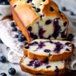 A loaf of blueberry cake with a golden brown crust sits on a wooden board covered with a white cloth, surrounded by fresh blueberries. The cake has been cut into thick slices, showing a light yellow, soft interior filled with juicy, dark blue blueberries spread evenly throughout. The crust is slightly cracked on top, revealing some of the blueberries peeking through. The wooden board and scattered blueberries add a natural touch, while the background is a white marbled texture. photo taken with an iphone --ar 4:5 --v 7
