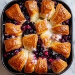 This Blueberry Cream Cheese Croissant Casserole is a deliciously indulgent breakfast or brunch dish featuring flaky croissants soaked in a luscious custard, studded with fresh blueberries, and swirled with creamy sweetened cream cheese. Perfect for making ahead and baking to golden perfection, it offers a delightful combination of flavors and textures.