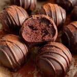 The image shows several round chocolate truffles with a smooth, dark brown chocolate outer shell, each decorated with thin, darker chocolate drizzle lines on top. One truffle in the center is bitten, revealing a dense, rich, and moist chocolate cake layer inside, with a slightly crumbly texture. The truffles rest closely together on a parchment paper-lined surface with cocoa powder dusting visible on some. The lighting highlights the shiny surface of the chocolate shell and the moist texture inside, creating a warm and inviting look. photo taken with an iphone --ar 4:5 --v 7