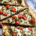 Keywords: Caprese, Chicken Flatbread, Pesto, Naan Pizza, Quick Dinner, Italian, Mozzarella, Cherry Tomatoes