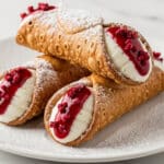 Three golden brown, crispy cannoli shells are stacked on a white plate, each filled with smooth, creamy white ricotta cheese. A shiny, deep red berry sauce with visible chunks is oozing from both open ends of the cannoli, adding a vibrant contrast. The shells have a bubbly, crunchy texture with a light dusting of powdered sugar on top and scattered around the plate. The white plate sits on a white marbled surface, making the warm colors of the dessert stand out. photo taken with an iphone --ar 4:5 --v 7
