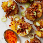 Crispy, flavorful chili oil smashed potatoes made by boiling baby potatoes until tender, smashing them flat, roasting to a golden crisp, and finishing with a spicy chili oil and scallion garnish. A perfect spicy side dish or snack with a satisfying crunch and a kick of heat.