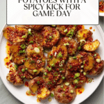 5. Garnish and serve: Transfer the crispy chili oil smashed potatoes to a serving platter. Garnish with sliced scallions and serve immediately with extra chili oil on the side for added spice.