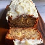 Keywords: banana bread, vegan banana bread, cinnamon swirl, vegan cream cheese frosting, cinnamon roll banana bread, baked banana bread, gluten free option