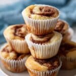 A stack of soft cinnamon roll muffins is shown in close-up, each muffin wrapped in white paper liners. The muffins have a light golden-brown top with visible swirls of darker cinnamon filling creating a marbled effect. The texture looks fluffy and moist, with the cinnamon layers slightly caramelized. Muffins are stacked on a white plate, resting on a white marbled surface, with a soft-focus blue cloth in the background. photo taken with an iphone --ar 4:5 --v 7