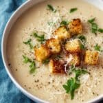 Classic Garlic Soup is a creamy, comforting dish that combines the savory flavors of roasted garlic, sautéed onions, and tender potatoes, blended into a smooth, rich broth enriched with cream and parmesan cheese. Garnished with fresh parsley and croutons, it makes a perfect appetizer or light meal with its deep, mellow garlic flavor and velvety texture.
