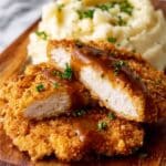The image shows two thick, crispy fried chicken cutlets on a wooden board with golden brown crunchy breading. One cutlet is cut in half, revealing juicy white meat inside. Both cutlets have smooth brown gravy poured on top, adding a glossy texture. In the background, there is a large scoop of creamy mashed potatoes with small green parsley pieces sprinkled on top. The whole scene is set on a white marbled surface. Photo taken with an iphone --ar 4:5 --v 7