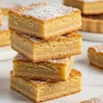 The image shows a stack of four square blondie bars on a white marbled surface, with each bar having two visible layers: a dense, moist, light golden bottom layer and a slightly crispier, darker golden top layer sprinkled with powdered sugar. The texture looks soft and crumbly, with the edges slightly browned and rough. In the blurred background, there are more pieces of similar bars and a tart, all on the same white marbled surface. Photo taken with an iphone --ar 4:5 --v 7