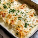 These Creamy White Chicken Enchiladas feature tender shredded chicken wrapped in soft flour tortillas, smothered in a rich and velvety white sauce made from a buttery roux, chicken broth, and sour cream, then baked with a generous layer of melted Monterey Jack and cheddar cheese. The addition of green chiles, fresh cilantro, and diced onions adds a vibrant flavor and texture to this comforting Mexican-inspired dish, perfect for a family dinner or casual gathering.