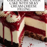 Keywords: red velvet cheesecake, layered cake, cream cheese frosting, decadent dessert, party cake, holiday dessert
