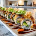 Learn how to make delicious homemade Dragon Rolls with cooked sushi rice, shrimp, avocado, cucumber, and crispy tempura flakes, all drizzled with flavorful unagi sauce. Perfect for sushi lovers craving a fresh and impressive roll you can prepare in just 30 minutes.