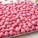 Keywords: strawberry puppy chow, white chocolate snack mix, strawberry shortcake snack, sweet cereal mix, easy no-bake treat