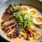 This Fiery Chicken Ramen with Creamy Garlic Sauce is a comforting and flavorful dish combining tender pan-seared chicken breasts with spicy red pepper flakes and a rich, creamy garlic-infused broth. Fresh ramen noodles simmered in a savory chicken broth enriched with soy sauce create a perfect base, finished with fresh green onions and optional cilantro for a vibrant touch. An ideal meal for those seeking a spicy, creamy twist on classic ramen.