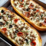 These French Bread Pizza Boats are a fun and easy dinner option perfect for family meals or casual gatherings. Crusty French bread is transformed into mini pizza vessels loaded with classic toppings like mozzarella, pepperoni, sausage, olives, and fresh vegetables, all baked to golden perfection with melted cheese and seasoned olive oil.