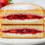 Two pieces of toasted sandwich are stacked on a white plate with powdered sugar lightly dusted on top and around. Each sandwich has three layers: the top and bottom layers are golden-brown toasted bread with a slightly crispy texture; the middle layers consist of a white creamy spread and a bright red jam, both evenly spread, with the jam appearing glossy and slightly dripping. In the blurred background, there are fresh red strawberries on a white marbled surface. photo taken with an iphone --ar 4:5 --v 7