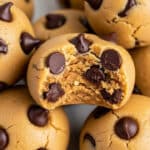 The image shows a close-up of round peanut butter cookie dough balls mixed with dark chocolate chips. The top layer is smooth and light brown with several dark chocolate chips scattered on the surface, some slightly melted. One cookie dough ball in the center has a bite taken out, revealing a dense, slightly grainy inside with some chocolate chips embedded throughout. The cookie dough balls are stacked closely together on a white marbled surface. photo taken with an iphone --ar 4:5 --v 7