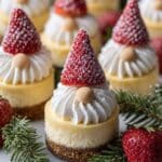 Gnome Mini Cheesecakes are adorable no-bake style individual cheesecakes perfect for festive occasions like Christmas. Featuring a buttery graham cracker crust and a creamy, smooth cheesecake filling, these mini delights are topped with fresh strawberries as gnome hats, whipped cream beards, and cute candy noses, making them not only delicious but charmingly whimsical.
