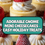 These Gnome Mini Cheesecakes are a delightful no-bake dessert perfect for holiday gatherings or any festive occasion. With a buttery graham cracker crust, creamy cheesecake filling, and cute strawberry hats, they’re sure to bring smiles to your table.