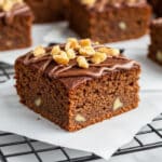A single square piece of brown cake with a moist, dense texture sits on white parchment paper placed over a black cooling rack, all set on a white marbled surface. The cake shows small bits of nuts inside, and its top is decorated with roughly chopped light brown nuts and drizzled with a smooth layer of milk chocolate across the surface. The background has a blurred view of more pieces of the same cake. photo taken with an iphone --ar 4:5 --v 7