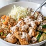 This Hibachi Bowls recipe brings the flavors of Japanese teppanyaki right to your kitchen with tender, savory chicken, sautéed vegetables, and flavorful fried rice all topped with signature yum yum sauce, sesame seeds, and fresh green onions for a delicious and satisfying meal.
