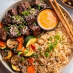 This Hibachi Steak Bowl recipe features tender top sirloin steak marinated in mirin, garlic, and ginger, then seared to perfection and glazed with teriyaki sauce. Served alongside sautéed carrots, zucchini, mushrooms, and fried rice, topped with a drizzle of creamy Yum Yum sauce for authentic Japanese steakhouse flavors at home.