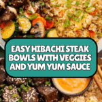 Keywords: Hibachi steak bowl, Japanese steak bowl, teriyaki steak, sautéed vegetables, Yum Yum sauce, easy Japanese recipe