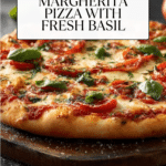 This homemade Margherita pizza recipe features a crisp thin crust topped with a flavorful homemade herb-infused pizza sauce, melted mozzarella, fresh Roma tomato slices, parmesan cheese, and fragrant basil leaves. Perfectly baked to achieve a golden crust and bubbly cheese, this classic Italian favorite is simple to prepare and ideal for a delicious dinner or casual gathering.