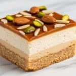 A square piece of dessert with three clear layers sits on a white marbled surface. The bottom layer is a crumbly golden crust, slightly uneven at the edges. The middle layer is thick, creamy, and pale beige with a soft, smooth texture. The top layer is a shiny, light caramel glaze that glistens with a sticky appearance. Scattered on top are whole and sliced almonds and green pistachios, adding a mix of brown and green colors with a crunchy texture contrast. Photo taken with an iphone --ar 4:5 --v 7
