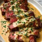 - Serve: Plate the rested steaks and generously spoon the creamy garlic sauce over the top. Serve immediately for a rich, flavorful meal.