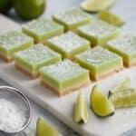 Store lime bars in an airtight container in the refrigerator for up to 4 days. They’re best served cold but can be brought to room temperature for a few minutes before enjoying. For longer storage, freeze the bars for up to 1 month and thaw in the refrigerator overnight.