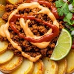 - Step 7: Assemble the bowls by dividing the crispy potato slices evenly. Top with the taco meat, then drizzle generously with the cheese sauce.