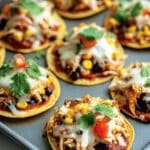 This Mexican Rotisserie Chicken Tostadas recipe features crispy baked corn tortillas topped with a savory mixture of shredded rotisserie chicken, seasoned black beans, corn, and salsa. Finished with melted colby jack cheese and garnished with fresh cilantro and tomatoes, these tostadas offer a quick, flavorful meal that balances textures and authentic Mexican flavors.