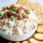 - Serve and garnish: Before serving, optionally garnish the dip with additional chopped green onions and extra crumbled bacon for presentation. Serve chilled with crackers, celery slices, or sliced baguette to enjoy.