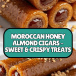 Moroccan Honey Almond Cigars are delicate, crunchy pastries filled with a fragrant almond mixture and soaked in sweet honey syrup, offering an authentic taste of Moroccan cuisine with floral notes from orange blossom and rose water.