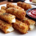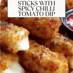 Crispy, golden mozzarella sticks coated in seasoned breadcrumbs and served with a spicy homemade chilli tomato dipping sauce. Perfectly fried to achieve a gooey cheese center and a crunchy exterior, these mozzarella sticks make an irresistible appetizer or snack.