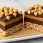 - Add the Chocolate Topping: In a microwave-safe bowl, melt the chocolate chips by heating them in 30-second intervals, stirring after each, until fully melted and smooth. For a richer and smoother chocolate topping, stir in a tablespoon of butter or coconut oil. Pour and spread the melted chocolate evenly over the peanut butter layer.