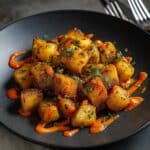 Patatas Bravas is a classic Spanish tapas dish featuring crispy roasted potatoes served with a smoky, spicy tomato sauce and a creamy garlic aioli. This recipe combines perfectly seasoned, oven-roasted potatoes with a rich bravas sauce made from diced tomatoes smoked paprika and chili powder, finished off with a zesty mayonnaise-based garlic aioli. It’s a delicious appetizer or side dish with vibrant flavors and a satisfying texture.