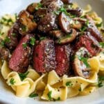 Peppercorn Steak Stroganoff served over tender egg noodles is a comforting and flavorful dish perfect for any night of the week. This recipe features juicy beef strips in a creamy peppercorn sauce with mushrooms and onions, making it a delicious twist on the classic stroganoff.