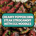 Peppercorn Steak Stroganoff Egg Noodles is a rich and creamy dish featuring tender seared beef strips cooked with mushrooms, onions, and cracked black peppercorns in a savory sour cream sauce. Served over perfectly cooked egg noodles, this comforting meal combines bold flavors with smooth textures for a satisfying dinner.