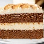 A close-up of a square slice of layered cake on a white plate placed on a white marbled surface. The cake has three main layers: the bottom and top layers are dark brown and crumbly with a moist texture, the middle layer is a rich caramel color, and there is a thick layer of creamy white frosting between the caramel and the top brown layer. The top of the cake is covered with a generous layer of smooth, off-white frosting with light swirls and sprinkled lightly with cinnamon powder. Photo taken with an iphone --ar 4:5 --v 7