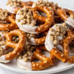 A white plate holds a pile of pretzels, each coated half with white icing and sprinkled generously with crushed pecans and small nut bits. The pretzels are golden brown with a smooth, glossy texture, while the crushed pecans add a rough, crumbly appearance on top. The white icing drips slightly, creating an uneven layer on part of each pretzel. Some nut crumbs are scattered around the plate, which is set on a white marbled surface. The photo is taken with an iphone --ar 4:5 --v 7