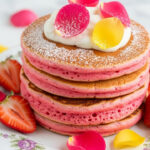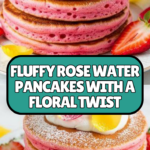 Keywords: rose water pancakes, floral pancakes, breakfast pancakes, rose petal garnish, pink pancakes