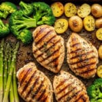 This Sheet Pan Garlic Butter Chicken and Veggies recipe is an easy and flavorful one-pan meal perfect for busy weeknights. Juicy chicken combined with tender potatoes, broccoli, and asparagus makes for a complete and satisfying dinner with minimal cleanup.