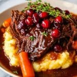 Keywords: beef roast, slow braised beef, balsamic glaze, cranberry sauce, Dutch oven roast, tender beef, comfort food, fall recipes, holiday roast