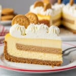 A close-up image of a slice of cheesecake on a white plate with a red rim, sitting on a white marbled surface. The cheesecake has three layers: a thick, crumbly brown crust at the bottom, a thick creamy yellow layer in the middle, and a thin layer of smooth white cream on top. There are dollops of white whipped cream on top of the cheesecake, each topped with a small round cookie. In the background, you can see blurred cookies and a glass of milk with red-striped straws. A woman's hand is gently holding a fork near the cheesecake. Photo taken with an iphone --ar 4:5 --v 7