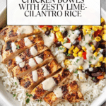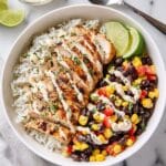 5. Assemble Bowls: Spoon 2 cups of cilantro lime rice into the base of each bowl. Slice the grilled chicken breasts into thin strips and arrange on top of the rice. Add ¼ cup of black bean corn salsa to each bowl, then drizzle with a tablespoon of the Southwest sauce. Serve immediately and enjoy!